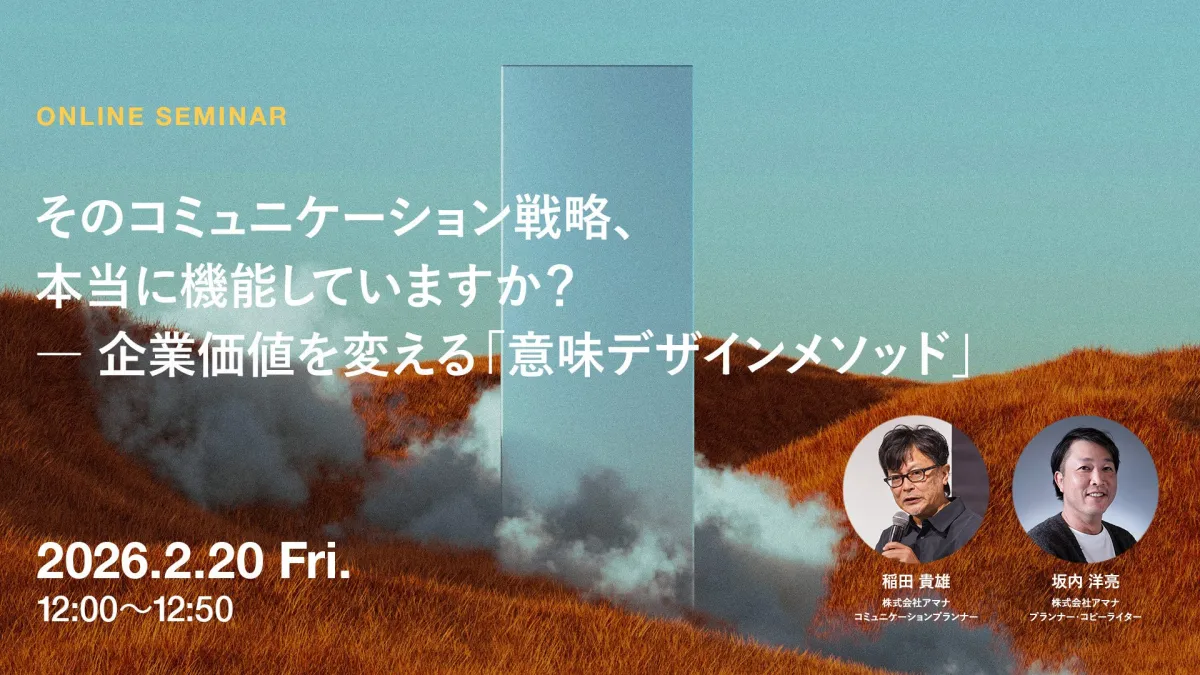 2026年2月20日、株式会社アマナが主催するウェビナーがデジタルプラットフォーム上で開催されます。このウェビナーは『そのコミュニケーション戦略、本当に機能していますか?― 企業価値を変える「意味デザインメソッド」』をテーマにしており、企業やブランドが直面するコミュニケーションにおける課題を解決する手法に焦点を当てます。