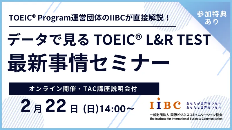 英語のスキルアップに興味がある方必見!一般財団法人国際ビジネスコミュニケーション協会(IIBC)とTAC株式会社が共同で、2026年2月22日(日)にTOEIC® L&R TESTに関するオンラインセミナーを開催します。このセミナーでは、TOEICの最新情報や有効活用法について詳しく知ることができるチャンスです。