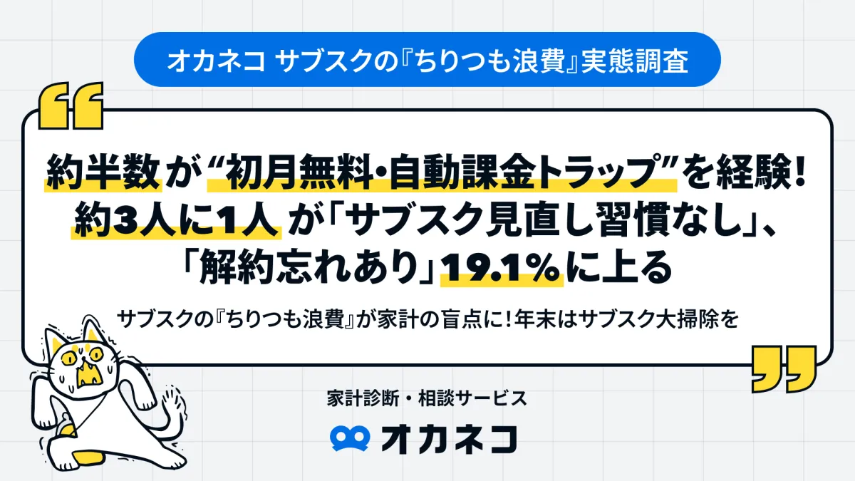 家計診断サービス『オカネコ』を運営する株式会社400Fが行った「オカネコ サブスクの『ちりつも浪費』実態調査」が話題を呼んでいます。この調査は独自に330人を対象に実施され、サブスクリプションサービスの実態が詳しく明らかになりました。