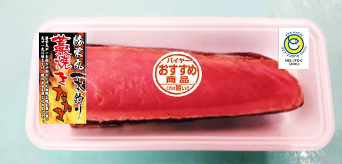 - - 特徴:このかつおは、静岡県産で一本釣り船「勝栄丸」によって漁獲され、船上で瞬間冷凍されるため、鮮度が保たれている。藁焼きで仕上げることで、香ばしい風味が楽しめる。