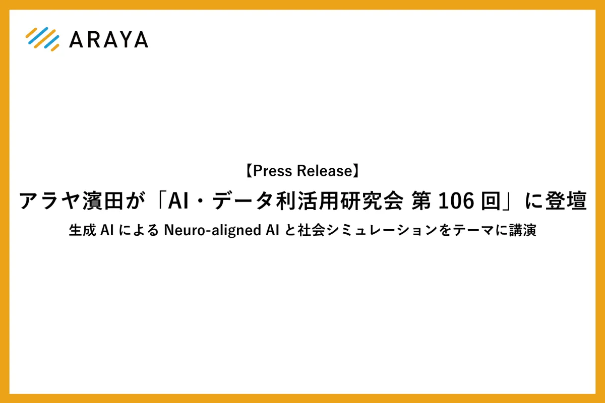 アラヤ株式会社は、2026年4月24日、オンラインで開催される「AI・データ利活用研究会 第106回」において、NeuroAI事業部のペルソナチームリーダー、濱田太陽氏が講演を行うと発表しました。講演のテーマは「生成AIによるNeuro-aligned AIと社会シミュレーション」で、非常に興味深い内容となっています。