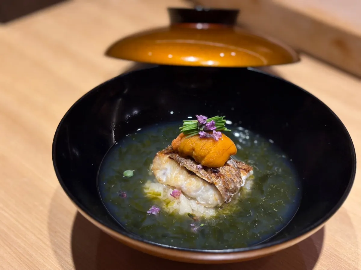この特別コースでは、「おまかせコース」として20品を8,800円(税込)というお手頃価格で提供されますが、その内容は決して妥協がありません。のどぐろは皮をパリッと焼き上げており、そこに新鮮な馬糞雲丹をトッピング。特製のシャリには独自に配合した赤酢が使用されており、これが食材の旨味を引き立てます。さらに、周囲には鮑と青い海草の出汁がかけられた特別な小丼が秀逸です。