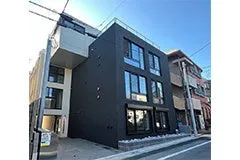 外観はマットな質感のダークトーンを基調とし、周囲の街並みに調和したスタイリッシュなデザインが特徴です。凹凸のある構成や大きな窓が、デザイナーズマンションならではの個性を引き立てています。