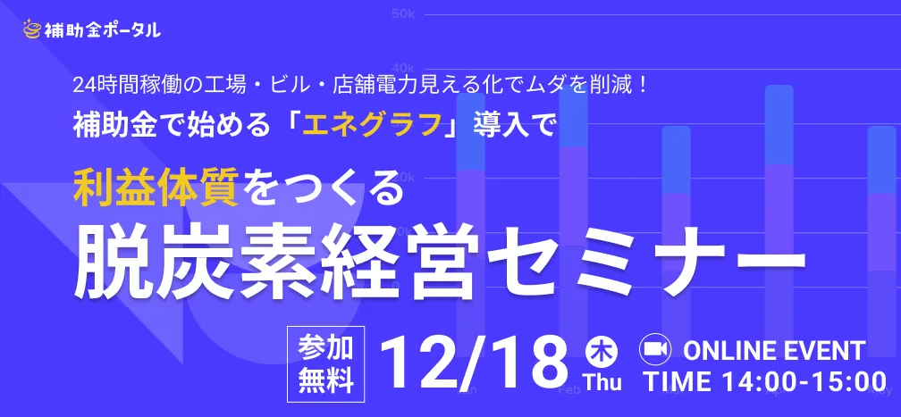 株式会社補助金ポータルは、2025年12月18日(木)の14時から、「補助金で始めるエネグラフ導入で利益体質をつくる脱炭素経営セミナー」を開催します。このセミナーでは、エネルギーの見える化と効率的な運用を通じて、企業が脱炭素経営を実現するための具体的な方法を紹介します。