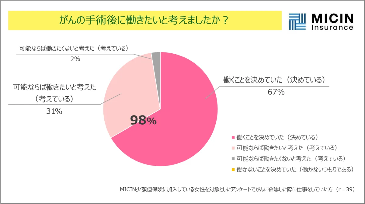 調査結果は驚くべきもので、がんに罹患した多くの女性が術後早期に仕事に復帰したいと考えていることが明らかになりました。がんが発覚した際、89%の女性が仕事に就いており、特に手術後すぐに復職したいという気持ちが強いことが示されています。実際、46%の女性が手術後1か月未満で復帰する意向を示し、過半数以上が術後3か月未満での復職を目指しています。