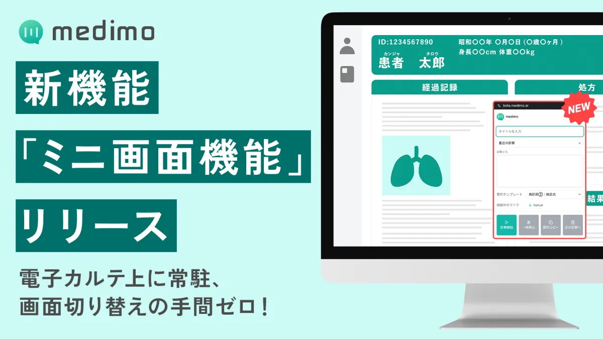 最近、医療AIスタートアップの株式会社medimoは、AIによる診療録作成支援システム「medimo」に新機能「ミニ画面機能」を追加しました。この新機能は、PC上で診療を行う際に、画面切り替えの手間を最小限にし、効率的な診療録作成を可能にするものです。