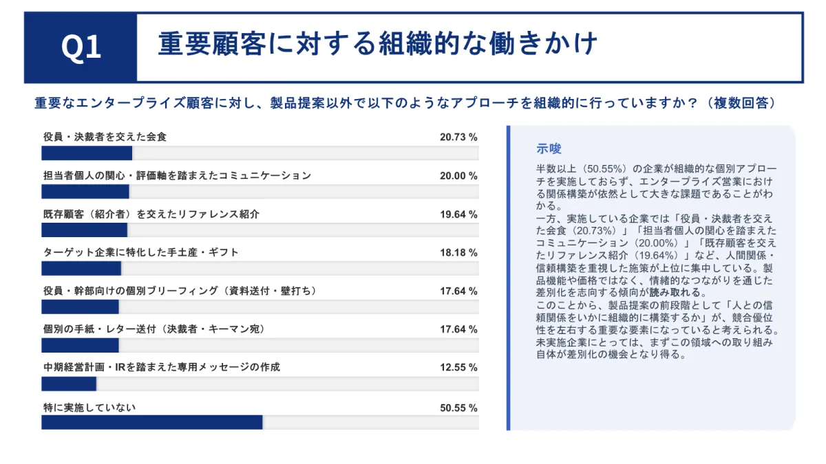調査結果によると、エンタープライズ顧客に対する情緒的アプローチの実施率は低く、50.55%の企業が「特に実施していない」と回答しました。一方、実施している企業のアプローチには、役員を交えた会食や担当者の関心を踏まえたコミュニケーションが含まれ、信頼構築が重視されていることがわかります。こうしたアプローチを行うことで、競合との差別化が図れる可能性があります。
