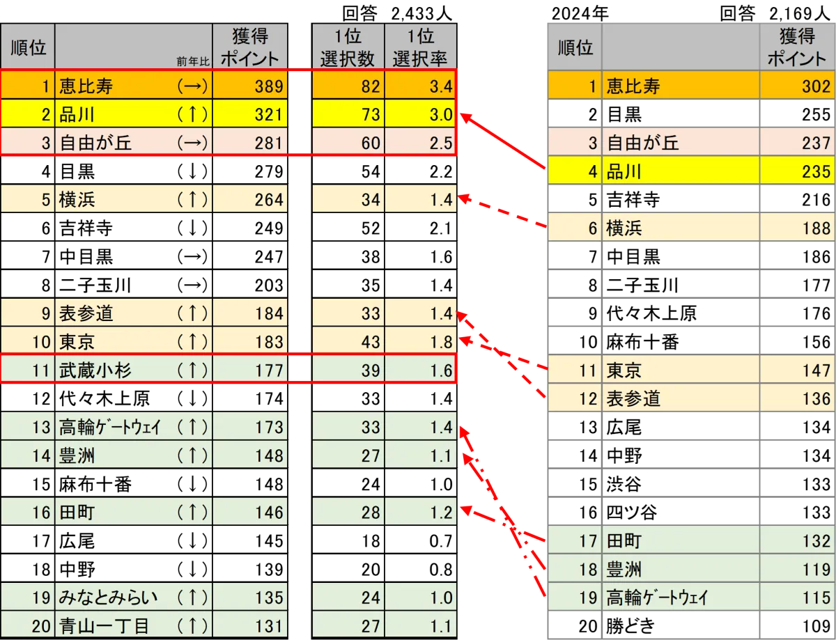 首都圏では、昨年に引き続き「恵比寿」が1位に輝きました。続いて2位は「品川」、3位「自由が丘」となっており、交通の利便性や商業施設の充実が評価されていることがわかります。