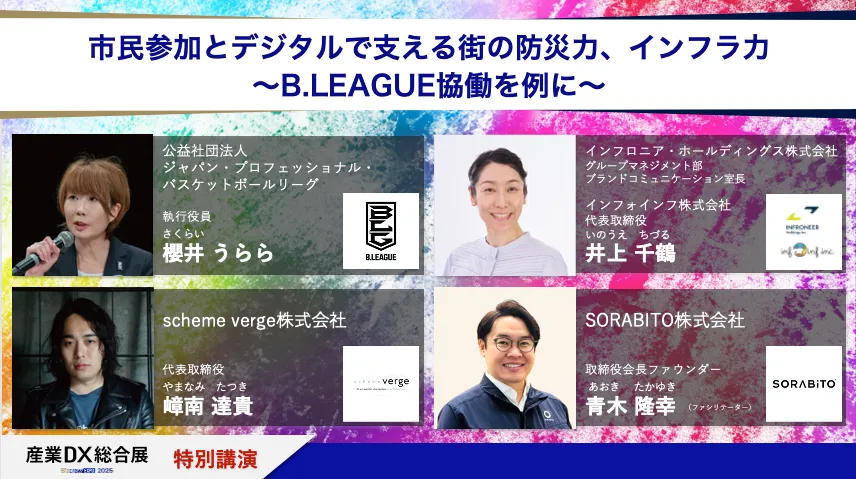 2025年7月30日、東京ビッグサイトで開催された「産業DX 総合展」では、特別講演セッション「市民参加とデジタルで支える街の防災力、インフラ力 ~B.LEAGUE協働を例に~」が実施されました。このトークセッションでは、公益社団法人ジャパン・プロフェッショナル・バスケットボールリーグ(B.LEAGUE)の櫻井うらら氏、インフロニア・ホールディングスの井上千鶴氏、scheme vergeの嶂南達貴氏が登壇し、ファシリテーターとしてSORABITOの青木隆幸氏がサポートしました。