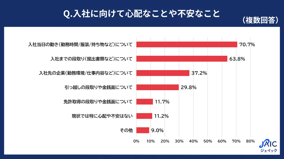 特に、入社日当日にどのように行動すればよいかという不安は、就職活動においても非常に重要な要因であることが明らかになりました。