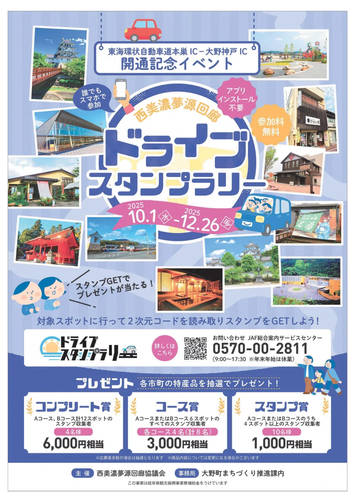 岐阜県で開催されるドライブスタンプラリー「西美濃夢源回廊」は、2025年10月1日(水)からスタートし、東海環状自動車道の本巣ICから大野神戸ICが開通した記念のイベントです。このスタンプラリーでは、大垣市や本巣市、神戸町、大野町、揖斐川町、池田町といった2市4町の観光名所や温泉、道の駅を巡ります。