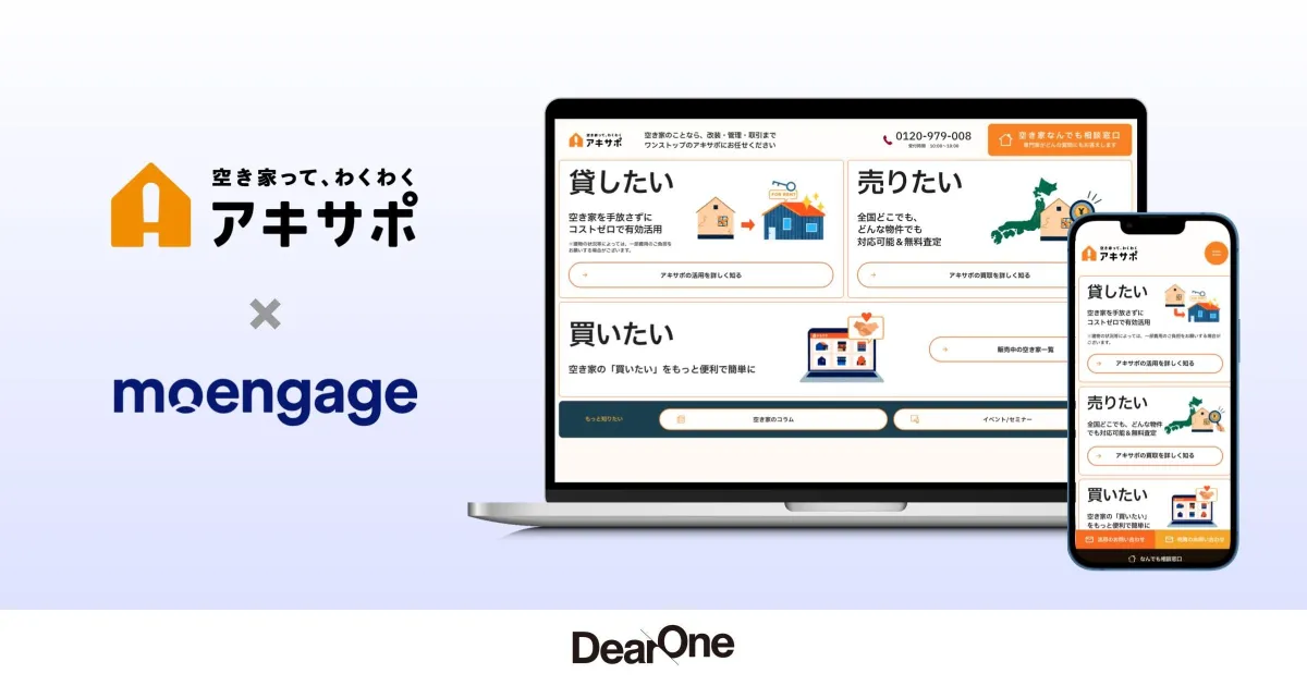 株式会社DearOneが空き家解決サービス「アキサポ」にマーケティングオートメーション(MA)ツールMoEngageの導入支援を行いました。この導入は、特に顧客エンゲージメントの深化を目指しており、相手のニーズに合った個別的な情報提供を可能にすることを意図しています。