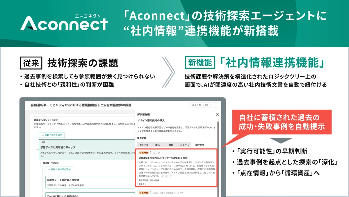「Aconnect」は業務を理解するAIがあなたの代わりに情報を検索し、必要な気づきを提供します。ビジネスニュースや論文、特許に加え、社内文書から情報を集約し、開発現場をサポートします。詳細は公式サイト(