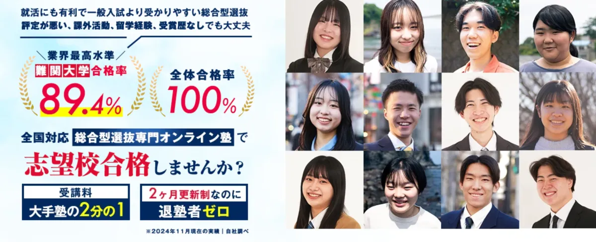 第3志望以内への合格が保証されたカリキュラムに基づき、学歴取得を支援します。特に、昨今の大学受験の厳しさを背景に、総合型選抜での成功がいかに重要かを実感しています。