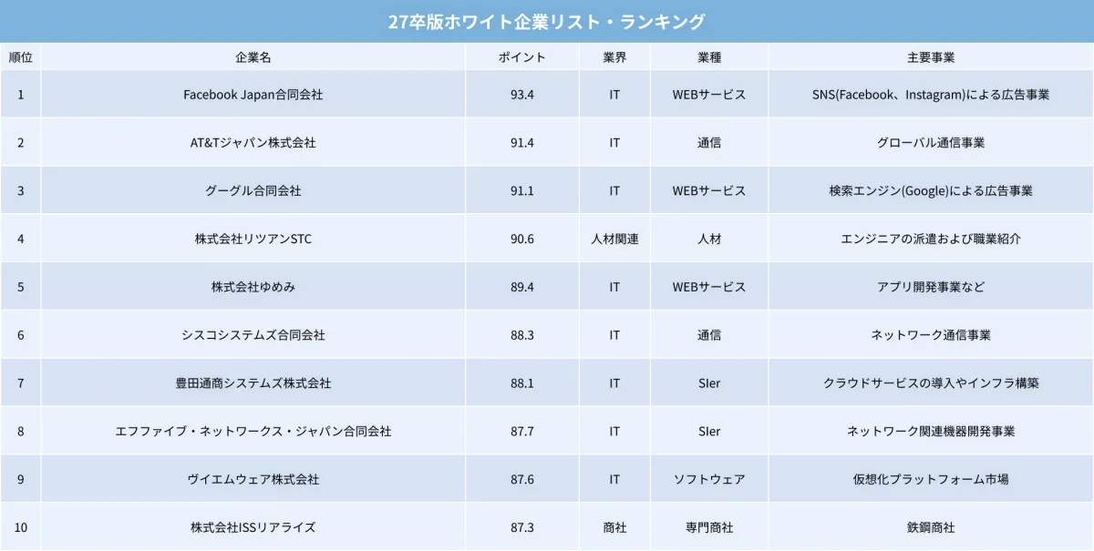 2027年卒版・一流ホワイト企業ランキングTOP100の発表