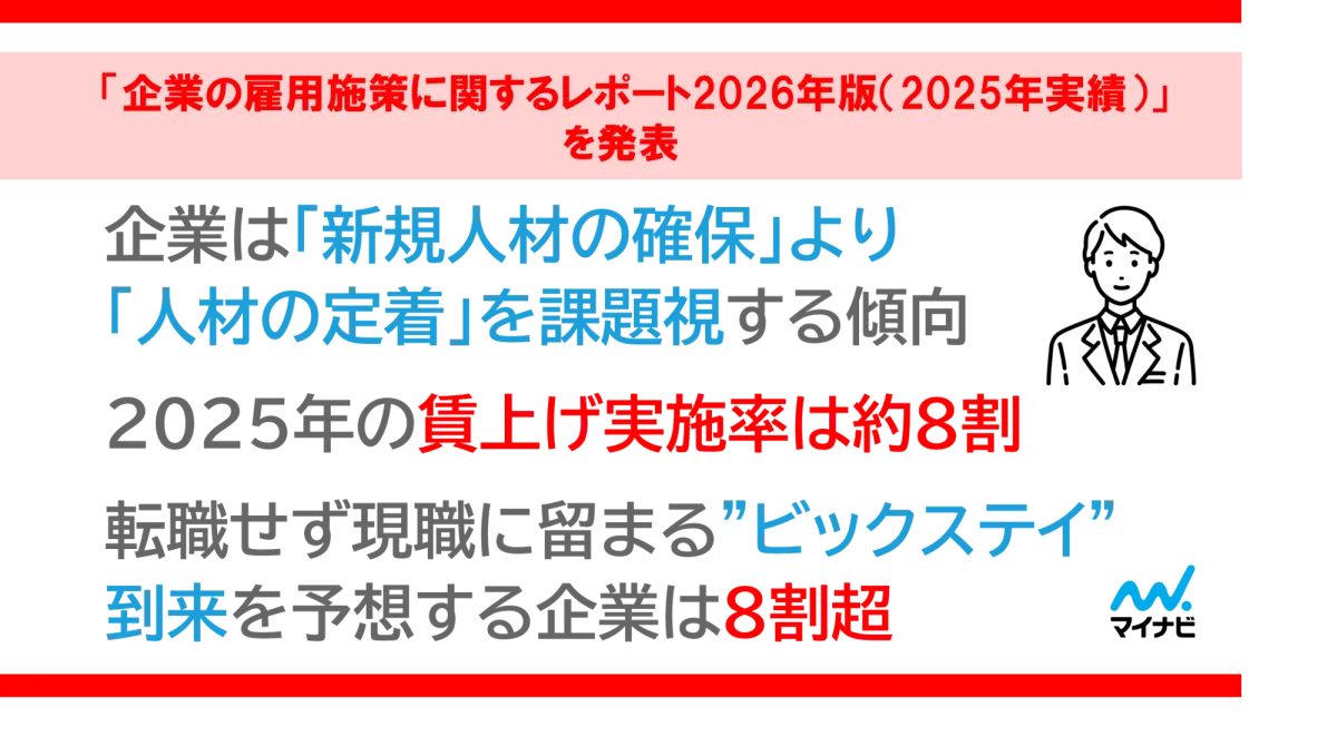 株式会社マイナビが発表した「企業の雇用施策に関するレポート2026年版(2025年実績)」からは、企業が直面する人材の定着や活用に関する意識の変化が浮き彫りになっています。このレポートは、1,500名の中途採用業務を担当する人事担当者を対象に行われました。