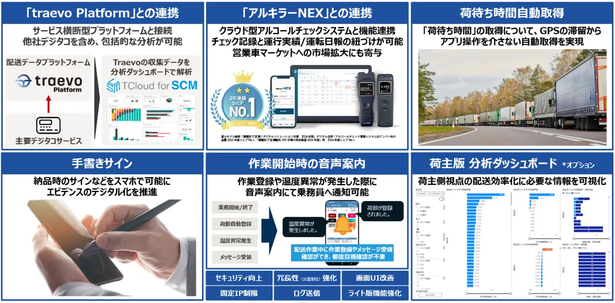また、GPSを利用した荷待ち時間の自動取得機能や、納品時に手書きのサインをスマートフォンで記入する機能も新たに導入されています。これによって、ドライバーの負担が軽減され、データ収集の効率が大幅に向上することが見込まれています。作業開始時には音声案内が行われるため、配送品質の向上にも寄与します。