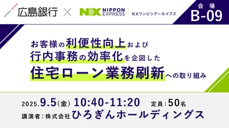 展示会の期間中、DXに関するセミナーも行います。セミナーでは、広島銀行が進めてきた住宅ローン業務の刷新について焦点を当てながら、NXワンビシアーカイブズのサービスがいかに役立ったのかを具体的に紹介します。特に、複雑だった電子契約システムの切り替えによる業務時間の削減効果は必見です。