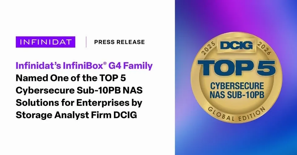 InfiniBoxⓇ G4ファミリーが、ストレージ業界調査会社であるDCIGのレポートにおいて「エンタープライズ向けサイバーセキュアNASソリューション(10PB未満)」のトップ5に選ばれたことを発表しました。この評価は、Infinidatのサイバーセキュリティに対する取り組みや技術的な革新が反映されています。