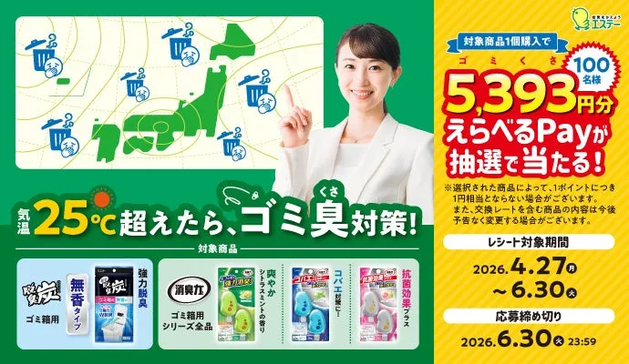 エステー株式会社は、2026年4月27日から6月30日まで、「消臭力 ゴミ箱用×脱臭炭 ゴミ箱用気温25℃超えたら、ゴミ臭(くさ)対策!キャンペーン」を開催します。このキャンペーンでは、指定された「消臭力 ゴミ箱用」シリーズと「脱臭炭 ゴミ箱用」の製品を購入することで、抽選で100名に5,393円分の「えらべるPay」が贈られます。