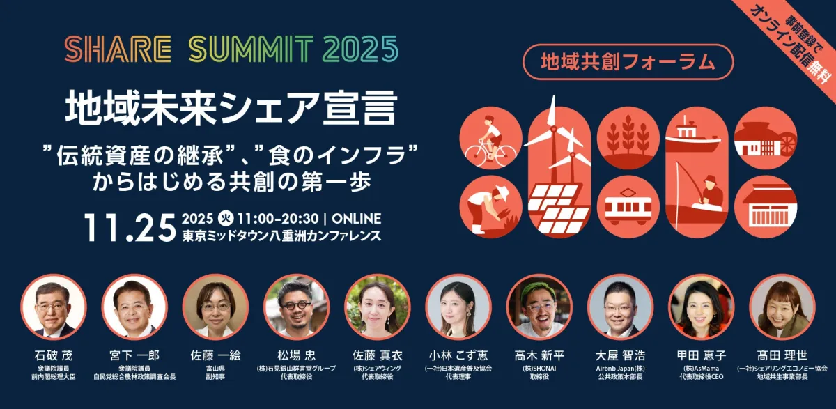 フォーラムでは、地域の「食のインフラ」を支える具体的な施策や、地域に受け継がれてきた文化や伝統資産をどう次世代に引き継いでいくかという視点から、共創を促進します。シェアリングエコノミーが日本で普及し始めてから約10年が経過した今、地域共創の第一歩を踏み出す必要性があることを強調します。