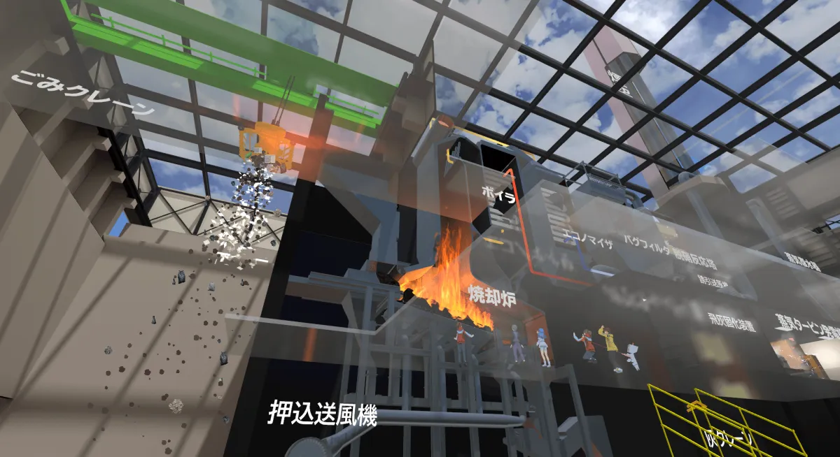 『Kanadevia Virtual Museum』は、私たちの社会を支えるインフラや技術を仮想空間上で「実物大」で再現したものです。このミュージアムでは、普通では入ることが難しい場所をゲーム感覚で探検できるようになっています。たとえば、ごみがエネルギーに変わる「ごみ焼却発電プラント」や、沖合に設置された「洋上風力発電」の巨大な風車の下、さらには津波から街を守る「海底設置型フラップゲート」まで、さまざまな場所へと安全にアクセスできます。