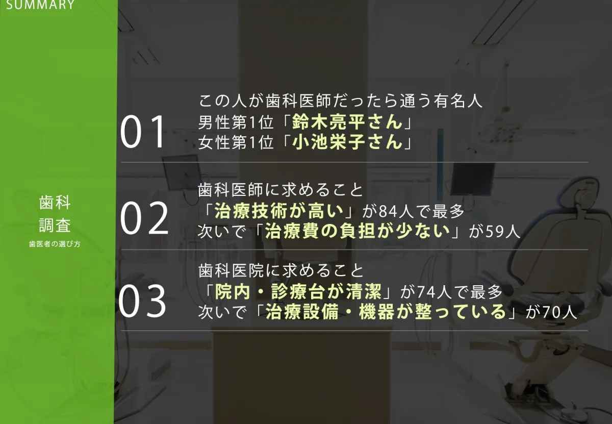 調査の結果、歯科医師に最も求められる条件は「治療技術の高さ」で、84人がこれを挙げています。その他にも「治療費の負担が少ない」と「治療が痛くない」という希望がありました。また、歯科医院に求める条件でも「院内が清潔」「治療設備が整っている」といった希望が目立ちました。