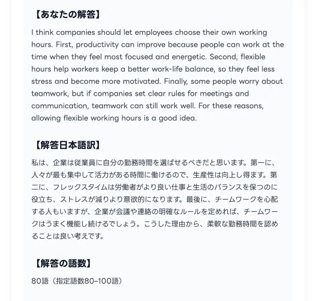 添削例の品質向上:指定語数レンジに沿った添削例の生成が実現されました。これにより、学習者は具体的な指導を受けやすくなります。