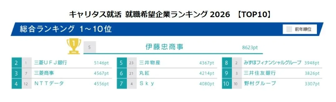 キャリタス就活、2026年卒業予定学生の企業ランキングを発表