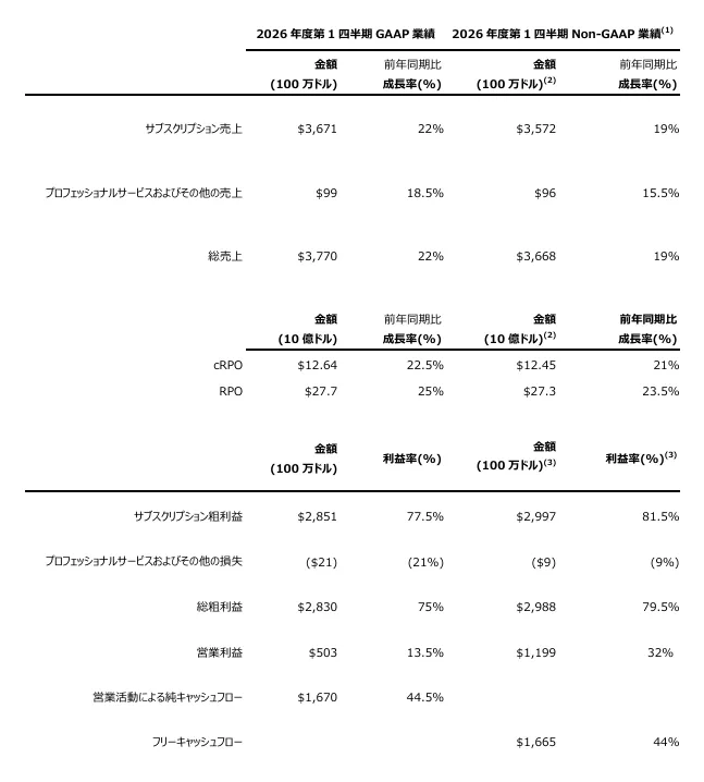 第1四半期末の当期残存履行義務(cRPO)は126.4億ドル、前年同期比22.5%増加し、為替変動を除くと21%の成長率を記録しました。また、年間契約価値(ACV)が100万ドルを超える顧客数は前年同期比で130%以上の増加を示しています。