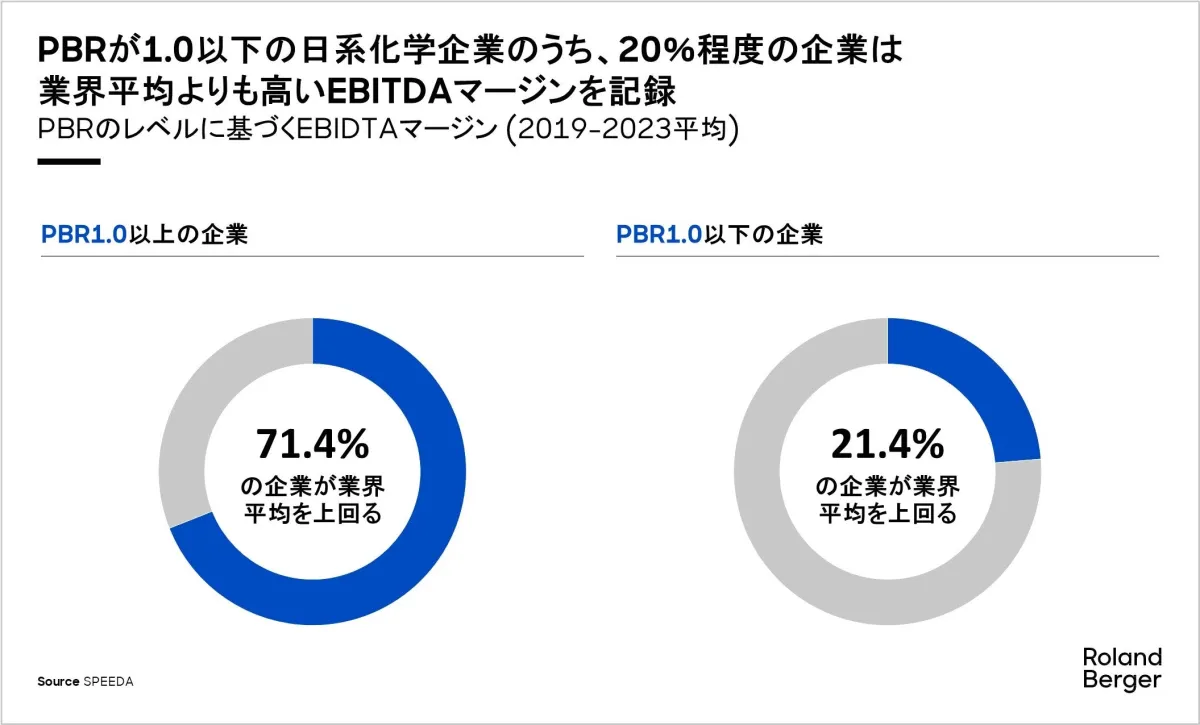 ローランド・ベルガーのレポートでは、低PBRの日系化学企業を3つの構造的要因に基づいて類型化しています。特に注目すべきは、PBRが1.0以下の企業の中でも、21.4%がEBITDAで業界平均を上回っている点です。この事実は、日系化学企業が企業価値を改善するための変革の可能性を示唆しています。