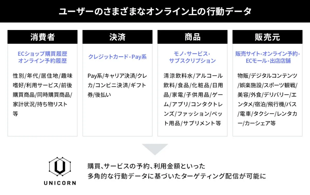 具体的には、UNICORNはユーザーの明確な同意を得た上で取得したデータを元に、様々なプラットフォームでの購買履歴やサービスの利用状況を分析。これにより、広告主は関心が高いと思われる層に対して、より効果的にアプローチできるようになります。また、費用対効果も向上する見込みです。