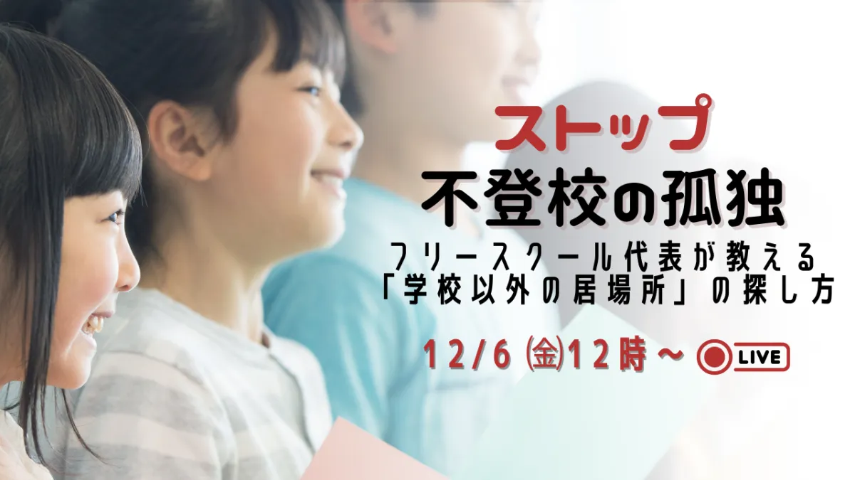 2024年12月6日(金)12時から13時30分にかけて、不登校のお子さんを持つ保護者向けのオンラインイベント「【ストップ不登校の孤独】フリースクール代表が教える『学校以外の居場所』の探し方」を開催します。このイベントでは、オンラインフリースクール「Branch」の代表、中里祐次さんをお迎えし、効果的な居場所の見つけ方についてお話しいただきます。