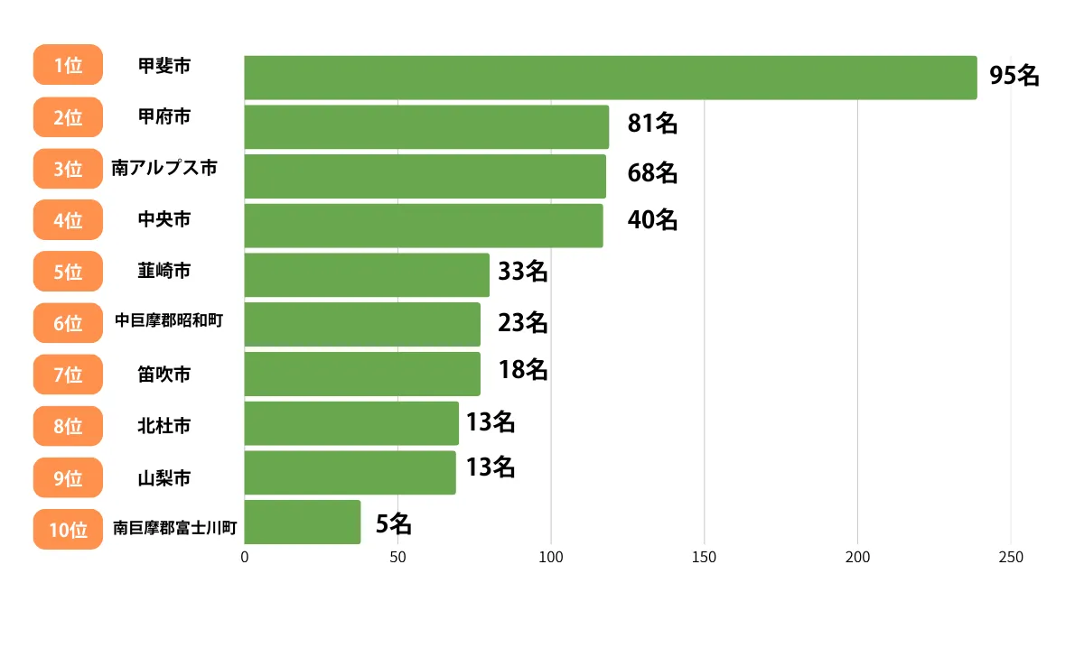 高所得者層からは、甲府市と南アルプス市が同じ数で支持されています。甲府市は便利な都市機能が集まるエリアとして評価される一方で、南アルプス市は自然環境と生活の質を重視する人たちに人気があります。ライフスタイルの選択が、居住エリア選びにも影響を与えていることが明らかです。