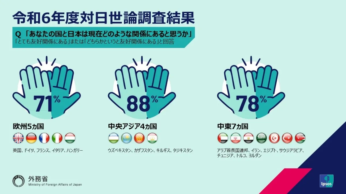 世界的に著名な世論調査会社、イプソス株式会社が、欧州、中東、中央アジアの国々で対日世論調査を実施しました。この調査は、日本の外務省の依頼を受けて行われ、さまざまな地域における日本への印象や友好度を測定しています。