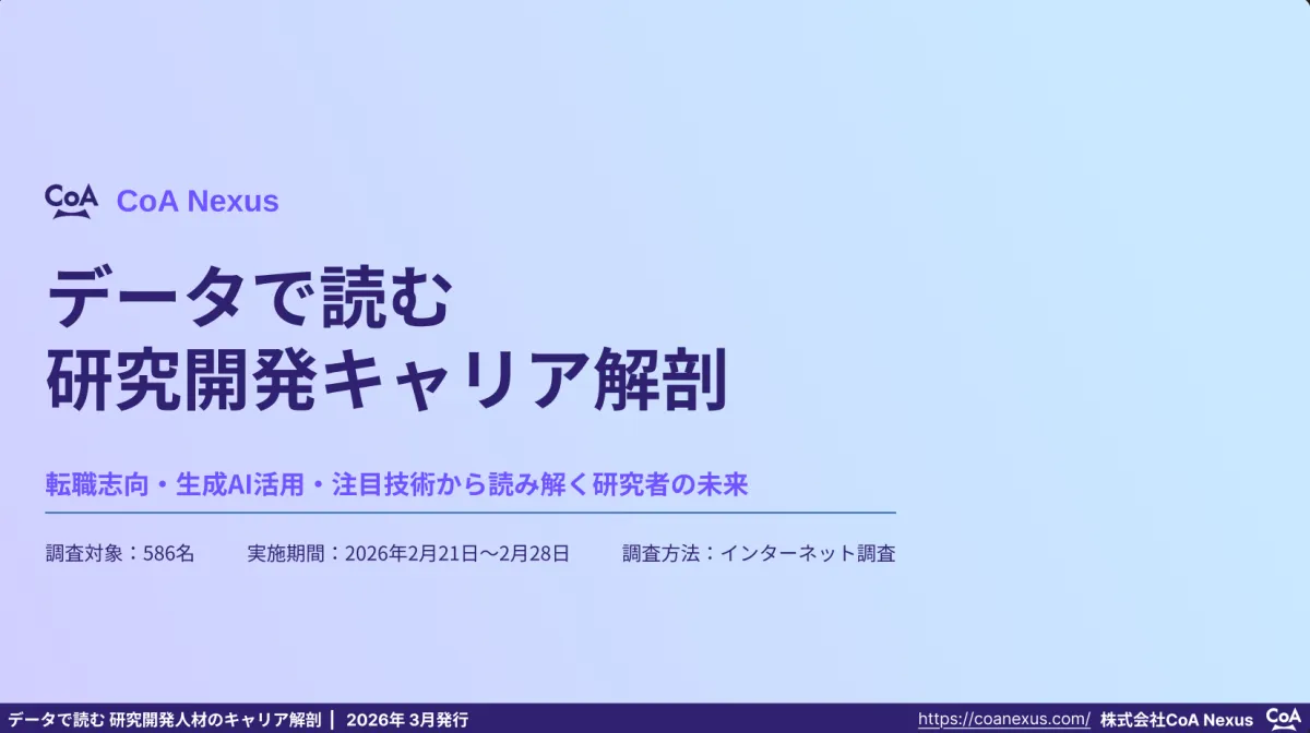 本調査「研究開発の未来とキャリア形成に関する実態調査」は、2026年2月21日から28日まで行われ、586名の研究者および技術者が対象となりました。調査内容は転職志向、報酬の実態、生成AIの活用状況、注目する研究テーマなど、多岐にわたります。
