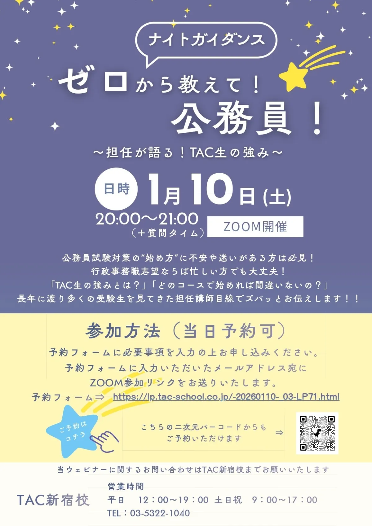 公務員試験への道を開くチャンスがやってきました!2026年1月10日(土)20:00から21:00にかけて、TACが "ゼロから教えて!公務員!~担任が語る!TAC生の強み~" というオンラインイベントを開催します。この特別なウェビナーでは、公務員試験に対する不安や疑問を解消するための内容が盛りだくさんです。