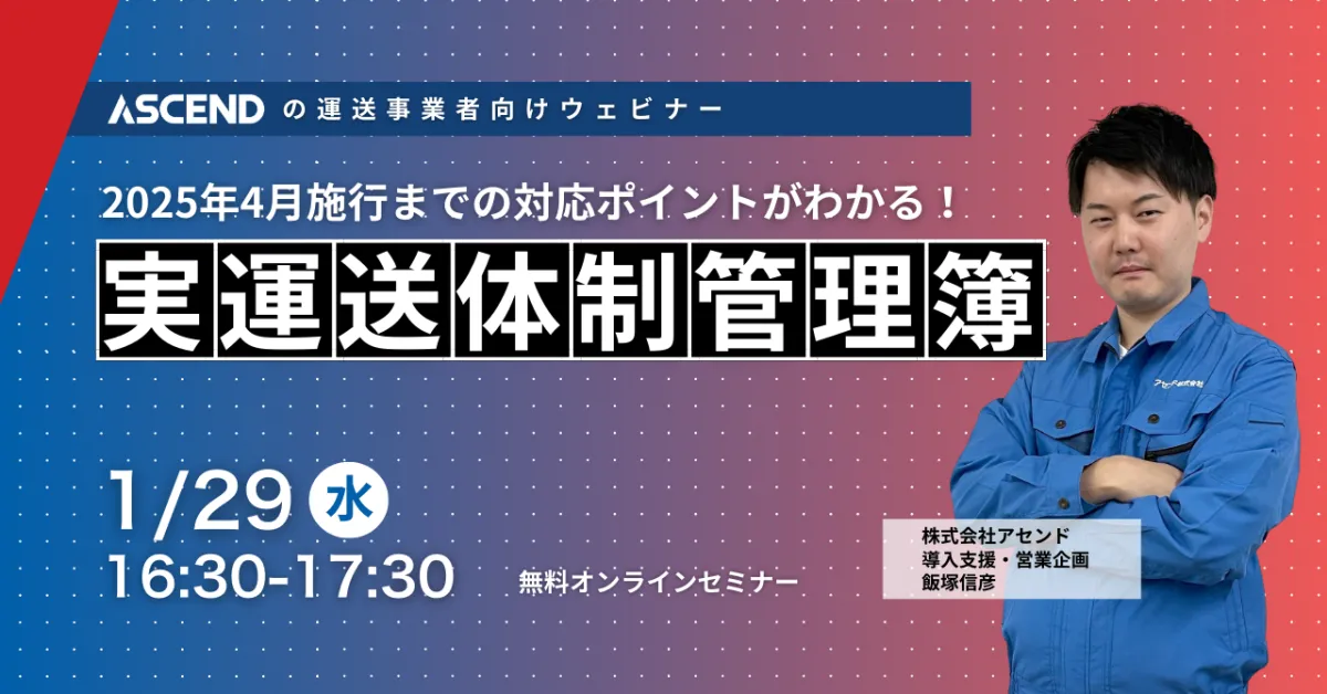 物流業界は日本経済の支柱として重要な役割を果たしていますが、2030年には約1/3の貨物が運搬できなくなるとの予測もあり、深刻な事態が懸念されています。このような中、アセンド株式会社は、2025年4月から施行される「実運送体制管理簿」の作成に関する無料オンラインセミナーを1月29日(水)に開催します。この新制度についての理解を深め、業界の課題解決につなげることを目的としています。