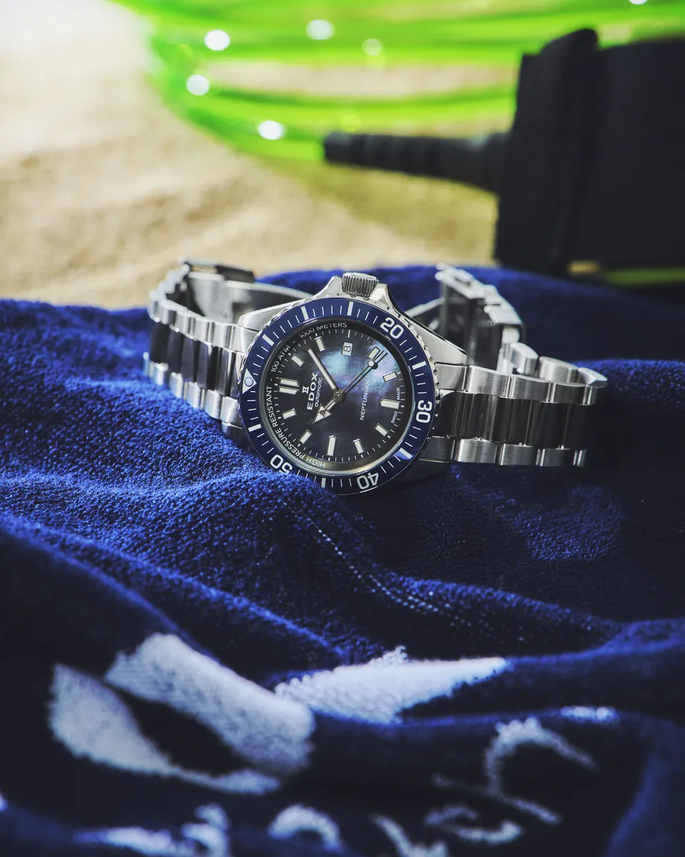 1. デザイン: タオルには、エドックスの人気コレクションである「ネプチュニアン」の裏蓋に刻印されている海の神・ネプチューンがデザインされています。この神秘的なデザインは、エドックスのスピリットを体現しており、海を愛する者にとって特別な意味を持つでしょう。