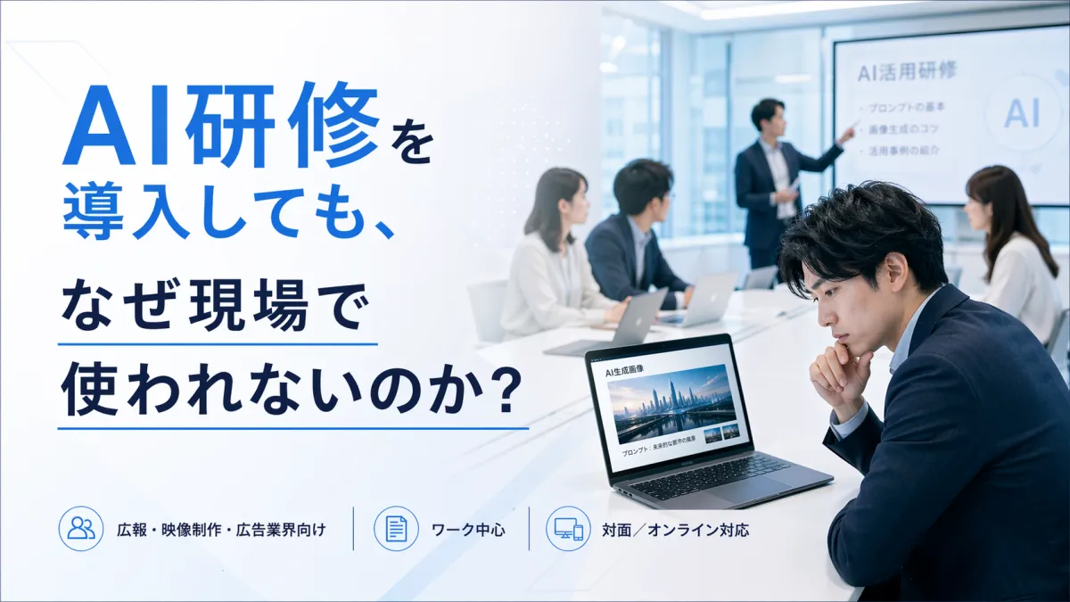 生成AIの導入が進む中でも、実際の業務に活かせていないケースが多く見受けられます。例えば、「研修を受けたが実務には役立たない」「ツールは導入したが使いこなせない」といった声が、広報・映像制作・広告業界の現場で聞かれるようになっています。これは、AI研修が単にツールの知識を深めるだけで、本質的な活用法を指導するものになっていないからです。そこで、AIrkaizが提供する研修内容は、単なる座学ではなく、実務で使える形にまでフォーカスを当てています。