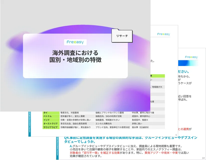 グローバルな市場に参入するには、各国の文化、経済、法規制がどのように調査に影響を与えるかを把握することが重要です。この資料を通じて、成功と失敗の具体例を知り、調査設計に役立てることが可能です。