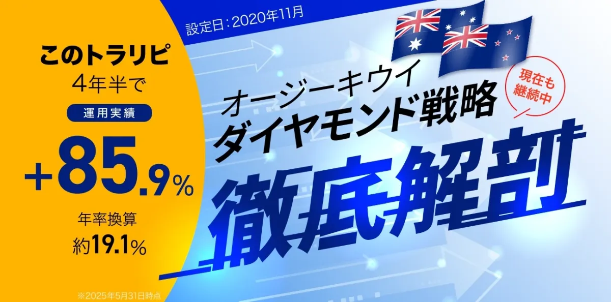 「毎日が財産になる」を企業スローガンに掲げる株式会社マネースクエア。この会社が、豪ドルとNZドルの通貨ペアであるオージーキウイに基づいた「オージーキウイ・ダイヤモンド戦略」の特設ページを公開しました。この戦略は、過去4年半で85.9%の運用実績を誇りますが、当然のことながら過去の実績が将来の利益を保証することはありません。