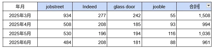 2025年6月末時点での求人件数は、「jobstreet」における484件を筆頭に、「Indeed」から208件、「glassdoor」から181件、「jooble」から88件が確認されており、複数の求人サイトで900件を超える求人募集が行われていることがわかります。特に「jobstreet」は全体の50%を占めており、フィリピンにおける最も主要な求人サイトと言えるでしょう。