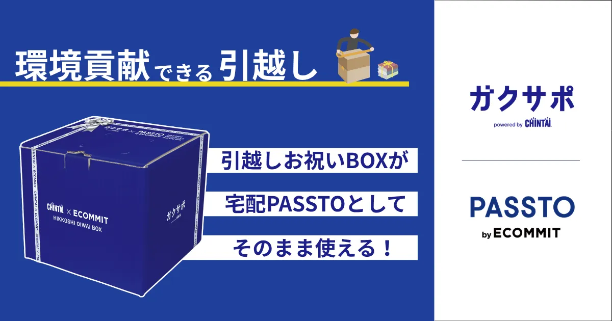 この新しい取り組みでは、CHINTAIが提供する『引越しお祝いBOX』に不要品を詰めて送るだけで、手軽に処分できる仕組みを搭載しました。引越しお祝いBOXには、日用品など新生活に必要なアイテムが無償で同梱されており、その箱を不要品回収用に活用することができます。ECOMMITが展開する『宅配PASSTO』サービスは、不要品を自宅から無料で回収し、再流通させるリユースサービスです。教育機関に在籍する学生向けに特化したこのサービスにより、手軽に不要品を手放しつつ、環境にも配慮することができます。