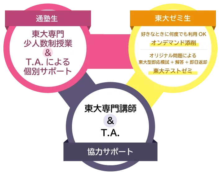 臨海セミナーは、講師やティーチングアシスタント(T.A.)との密接な連携により、受講生ひとりひとりに最適な指導を行っています。特にT.A.は、授業で不明な点を解消する重要な役割を果たし、受験生が学ぶ意欲を引き出しています。さらに、「通塾生」と「東大ゼミ生」の2つの受講スタイルを用意し、各生徒に対応したカリキュラムを展開しています。