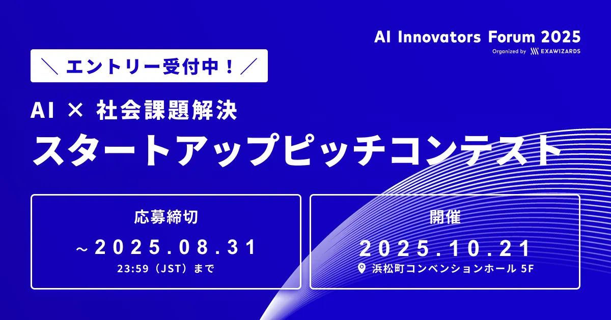 株式会社エクサウィザーズは、2025年10月21日(火)に「AI Innovators Forum 2025」内で、スタートアップピッチコンテストを開催します。このイベントは、AI技術を活用して社会課題を解決しようとする革新的なスタートアップを発掘し、支援することを目的としています。