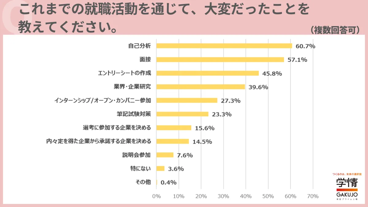 まず、就職活動で一番大変だったこととして最多の60.7%を占めたのが「自己分析」でした。次いで「面接」が57.1%、続いて「エントリーシートの作成」が45.8%、そして「業界・企業研究」が39.6%、最後に「インターンシップ/オープン・カンパニー参加」が27.3%という結果が出ました。