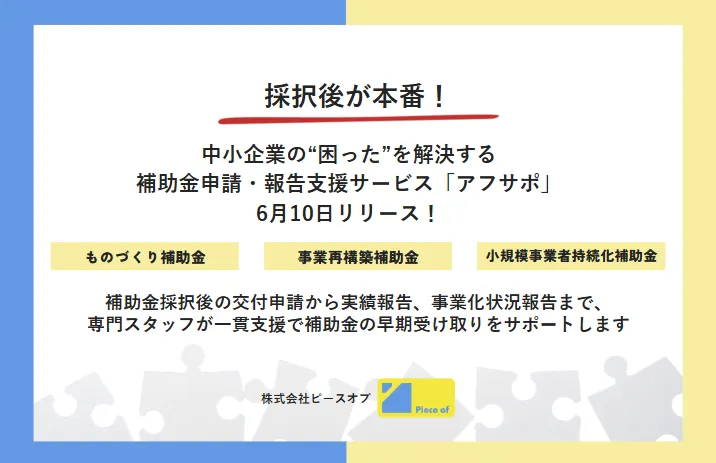 2025年6月10日、株式会社ピースオブから新たなサービス「アフサポ」がリリースされました。このサービスは、補助金を利用している中小企業やスタートアップを対象に、専門スタッフが申請から報告までの煩雑な事務手続きを一元的に支援するものです。特に、補助金の採択後に直面する難関を克服するための強力な手を差し伸べることを目的としています。