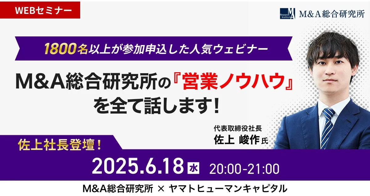 2025年6月18日(水)20:00より、ヤマトヒューマンキャピタル株式会社が主催するウェビナー『M&A総合研究所の営業ノウハウを全て話します!』が開催されます。このウェビナーは、M&A業界での営業ノウハウを深く理解したいと考えている方々にとって、非常に貴重な機会と言えるでしょう。