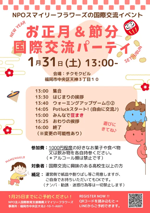 2026年1月31日、福岡市中央区天神に位置するチクモクビルで、「お正月&節分 国際交流パーティ」が開催されます。このイベントは、NPO法人国際教育支援機構スマイリーフラワーズによって主催され、地域の国際交流を促進することを目的としています。イベントは午後1時から始まり、参加者同士が自由に交流できる時間が設けられています。